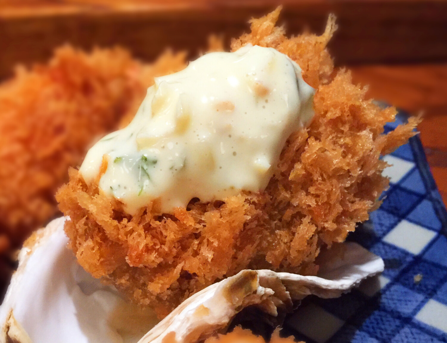 新鮮な生牡蠣を2~3粒をひとつにまとめ、特製生パン粉で優しく包みます。コーンサラダ油で高温揚げすることで、衣はさくっと牡蠣はジューシーに揚がります。生牡蠣だからこそのスッキリとしたクリーミーな味わいをご堪能下さい。