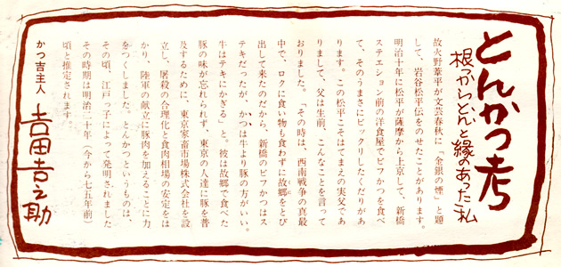 吉田吉之助の生涯とその人物について、長野県人会殿発行の『信州の東京』という機関誌(昭和56年4月号)に、『「かつ吉」主人・吉田吉之助』と題し、寄稿された記事がございます。