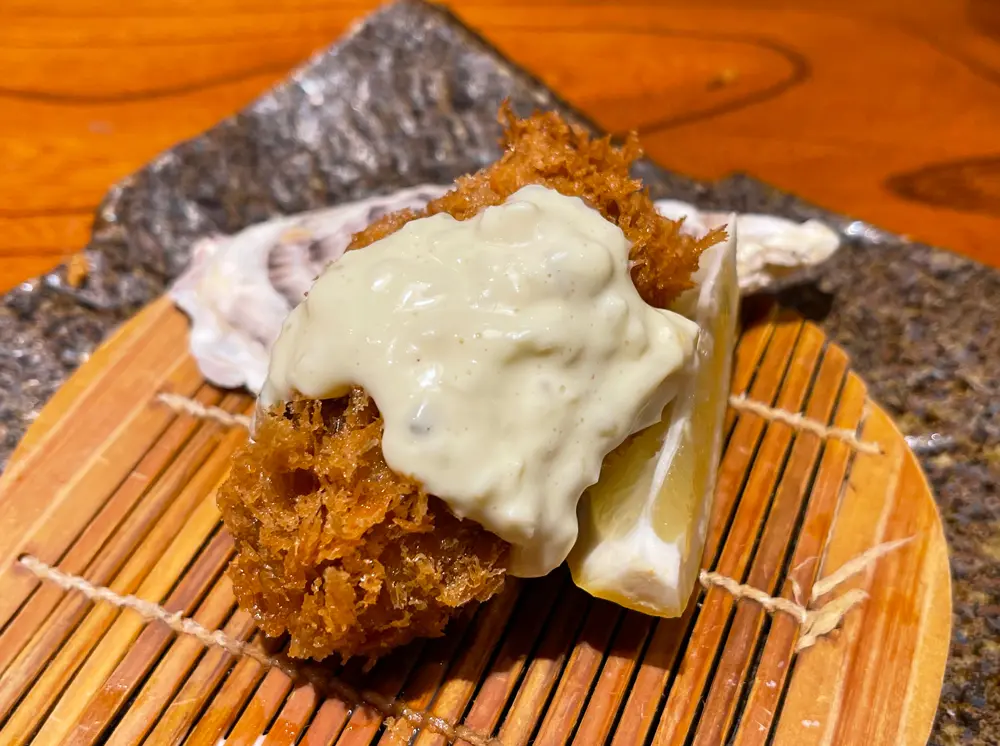 新鮮な牡蠣を数粒一緒に揚げることでジューシーな味わいを醸し出します。