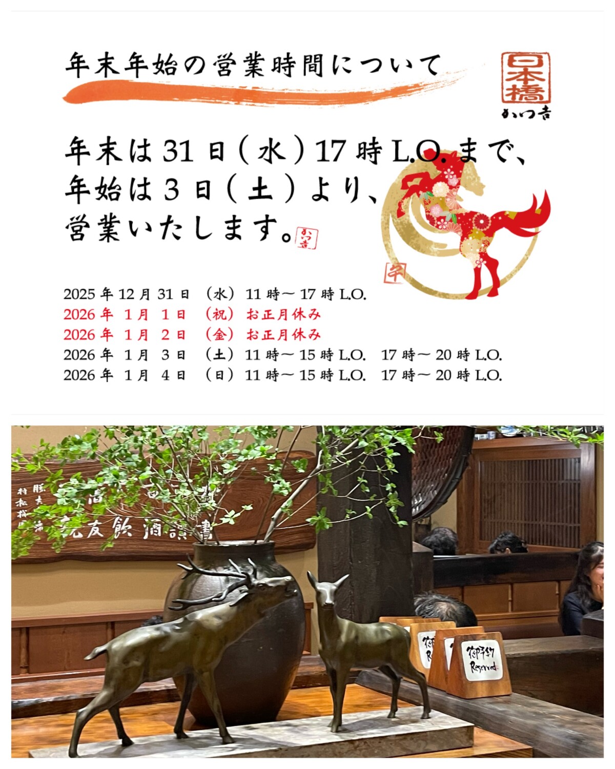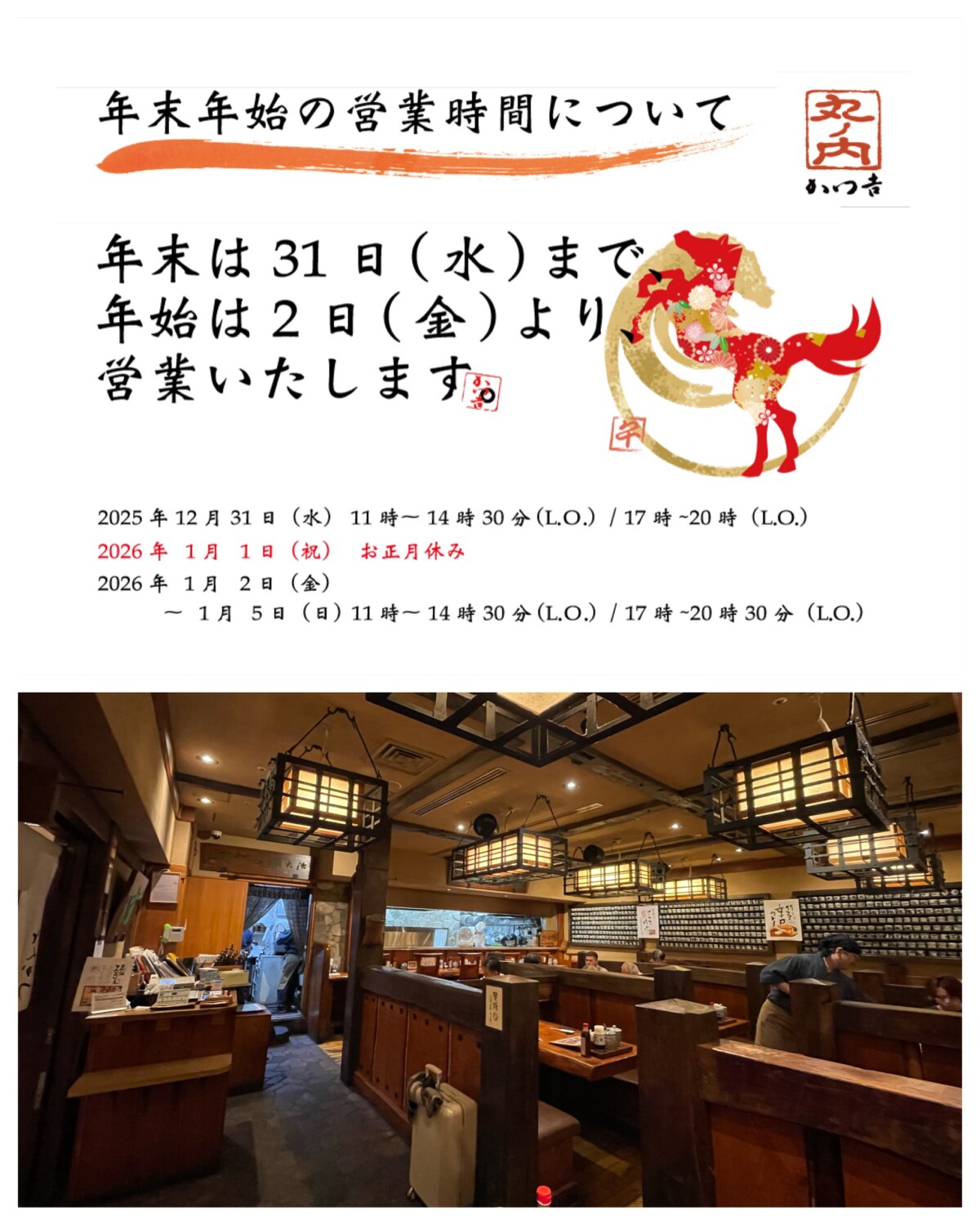 年末は 12月31日(水)17:00 L.O.まで、年始は 1月3日(土)より営業いたします。