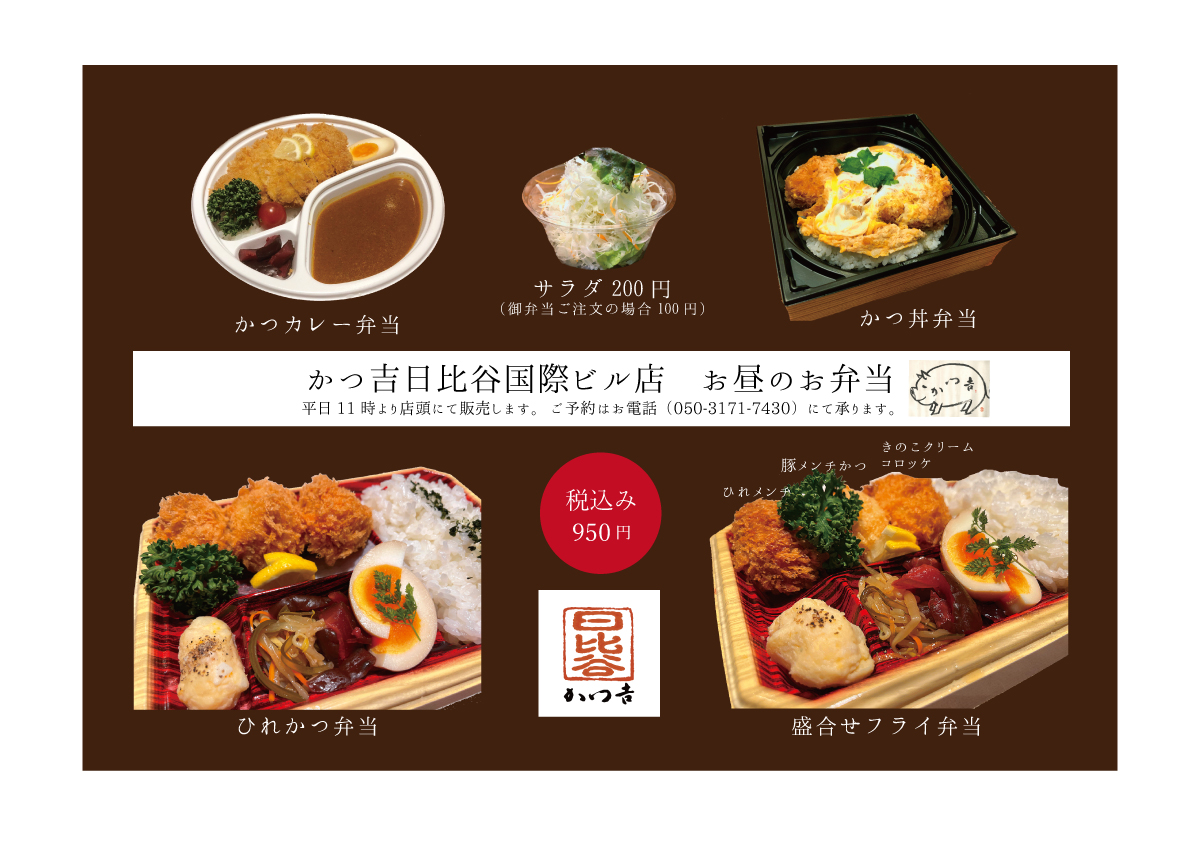 日比谷国際ビル店テイクアウトお弁当メニュー(7/5より価格改定)日比谷国際ビル店【お昼限定お弁当】平日11時過ぎより店頭にて販売いたします。※売切れ次第終了します。