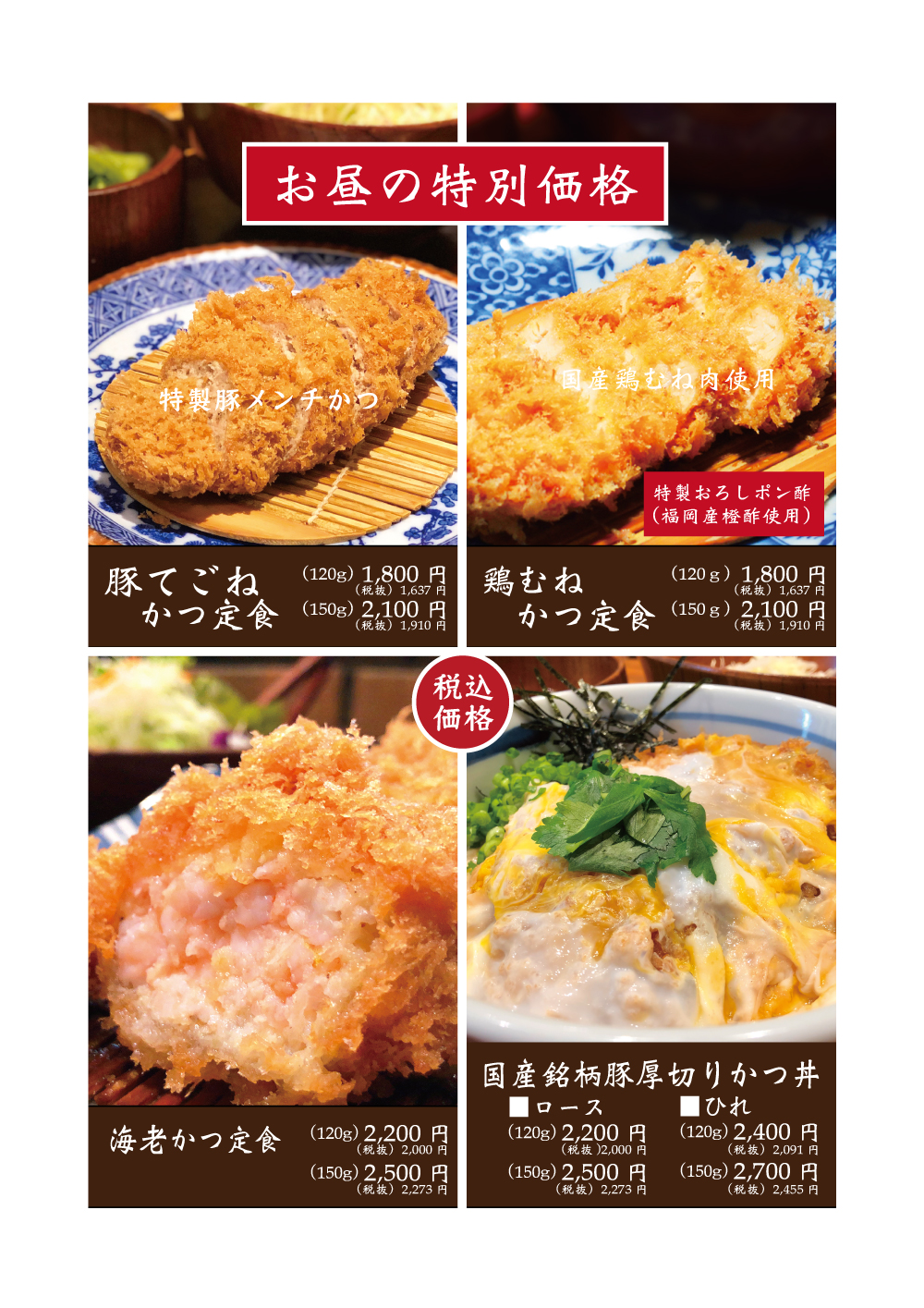・国産銘柄豚ひれかつ、海老かつ、旬フライ、野菜フライ